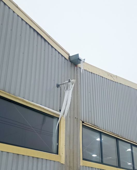 Камера видеонаблюдения, расположенная прямо под сливным желобом на крыше
