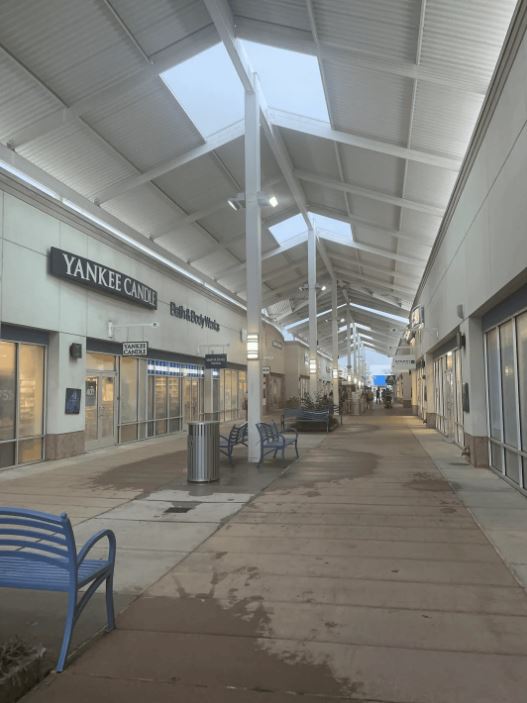 В торговом центре потолки есть везде, за исключением места, где стоят скамейки