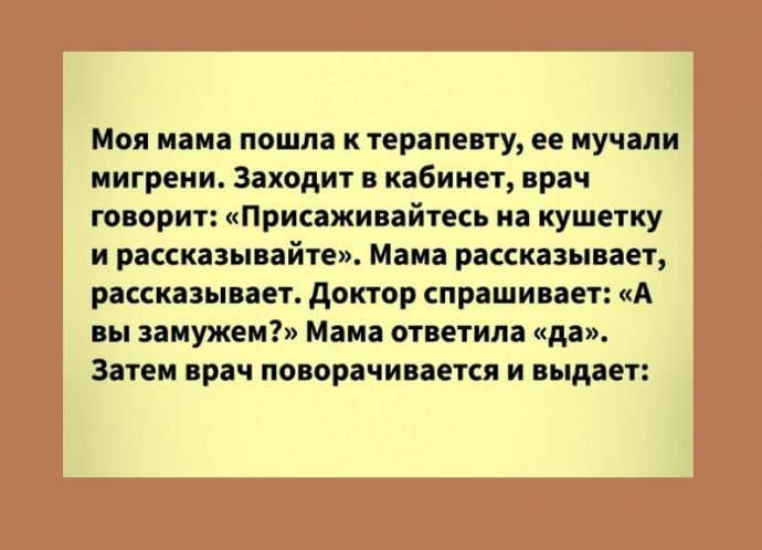Моя мама как-то пошла к терапевту, так как мучали мигрени, ничего делать не могла. Заходит она в кабинет, врач стоит и смотрит в окно, говорит: «Присаживайтесь на кушетку и рассказывайте». Мама рассказывает, рассказывает. Говорит, что голова болит жутко, ничего не помогает. Он же стоит возле окна и молча смотрит в него, мама закончила свой монолог, доктор молчит еще минуту, потом спрашивает: «А вы замужем?» Мама ему ответила «да». Затем врач поворачивается и выдает: «Так а что вы хотели? Чтобы и замужем быть, и голова не болела?» И зовет следующего пациента.