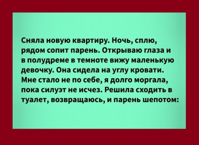 Сняла новую квартиру. Ночь, сплю, рядом сопит парень. Открываю глаза и в полудреме в темноте вижу маленькую девочку: темные волосы и розовый бантик. Она сидела на углу кровати. Мне стало не по себе, я долго моргала, пока силуэт не исчез. Решила сходить в туалет, возвращаюсь, и парень шепотом: «А ты уходила куда-то? Я все это время думал, что ты рядом лежала, открываю глаза, а тебя нет». Нам стало так страшно, что всю ночь глаз не сомкнули. А через месяц я узнала, что беременна девочкой.