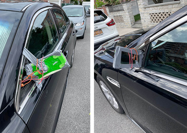 Для того, чтобы починить сломанное боковое зеркало, была применена швабра