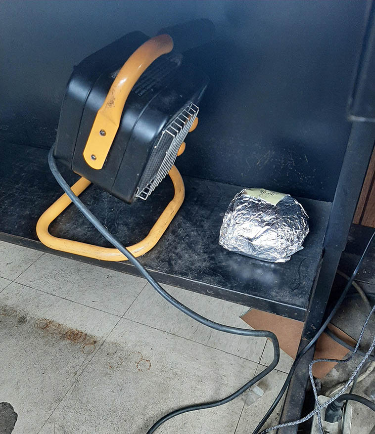 “У нас в офисе нет микроволновки, поэтому кто-то принес портативный обогреватель, которым все теперь пользуются.”