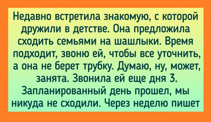 Я не сразу поняла, что происходит, потом напомнила, что полка наша. Девушка посмотрела обиженно и сказала, что они же едут до конца. Я ответила, что когда мы сойдем, они могут занять нашу полку и ехать до конца, а сейчас свои места займем мы сами. Нам сказали: «Ой, да пожа-а-а-луйста, кладите своего ребенка». И полезли наверх, где включили свет. Интересно, на что они рассчитывали. Очень странные молодые люди попались! © Татьяна Лобанова / ADME - Недавно встретила знакомую, с которой дружили в детстве. Она предложила сходить семьями на шашлыки. Время подходит, звоню ей, чтобы все уточнить, а она не берет трубку. Думаю, ну, может, занята. Звонила ей еще дня 3. Запланированный день прошел, мы никуда не сходили. Через неделю пишет: «Одолжи денег». Я выпала с такой наглости. © Подслушано / Ideer
