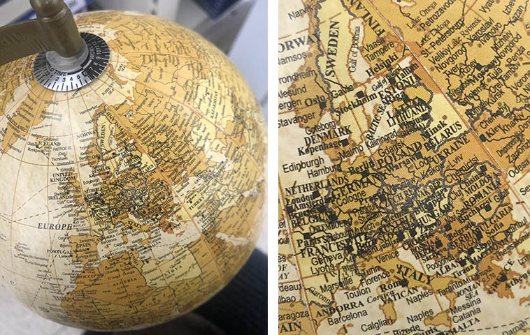Глобус, на котором невозможно прочитать названия многих мест. Особенно европейских.