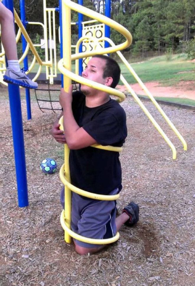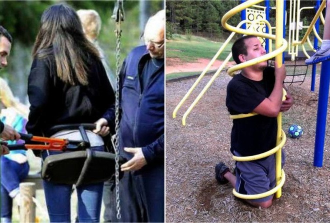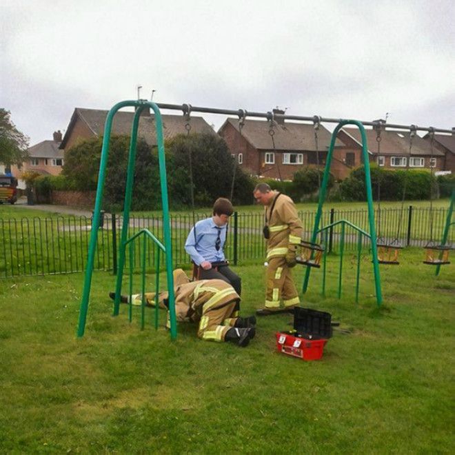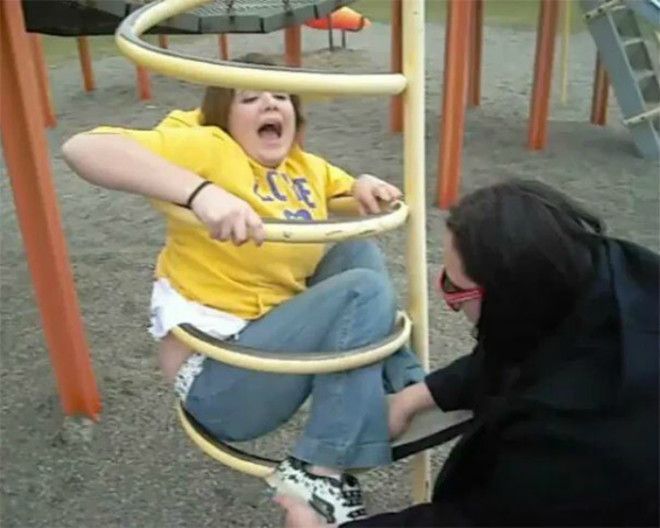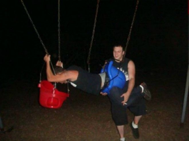 Все мы в душе дети! Но, глядя на некоторых личностей, иногда кажется, что не только в душе. Отправляясь на детскую площадку, взрослые забывают, что габариты уже не те.