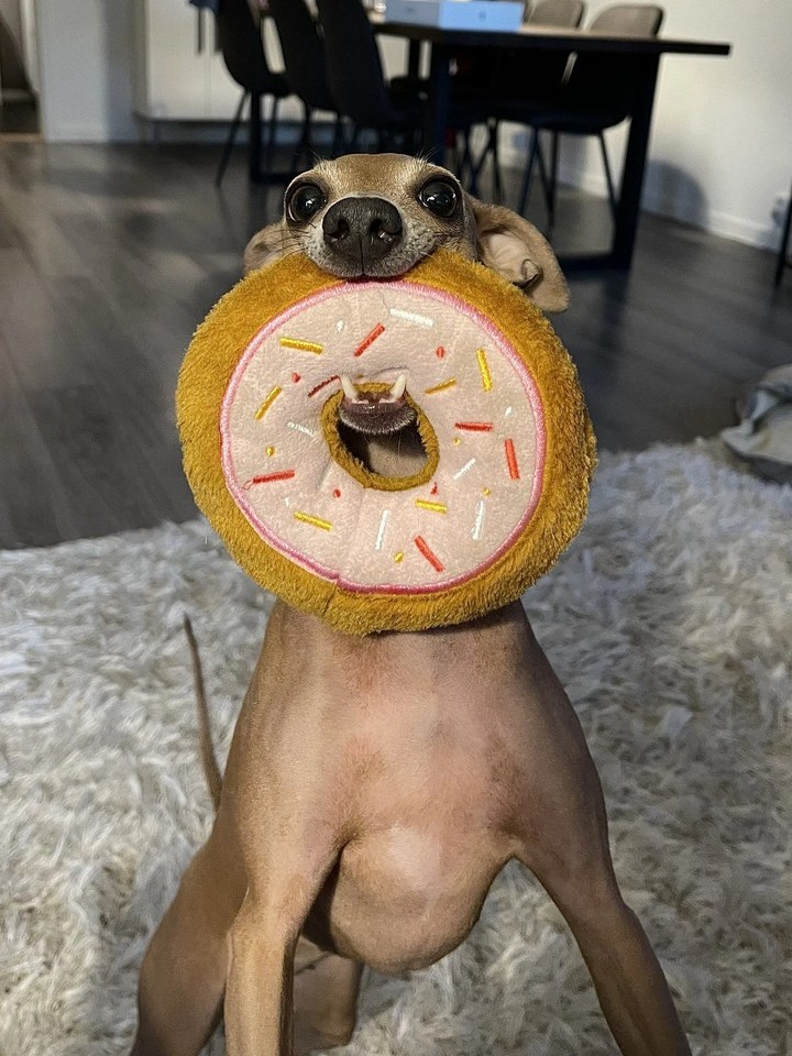 10. “Кажется, этот игрушечный пончик великоват для нашей собаки, но она отлично справляется”