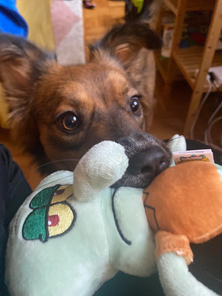 2. “У нашей собаки есть лучший друг. И это вечно недовольный игрушечный Сквидвард!”