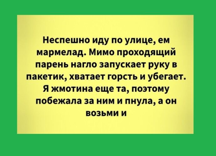 Неспешно иду по улице, ем мармелад. Мимо проходящий парень нагло запускает руку в пакетик, хватает горсть и, зло усмехаясь, убегает вперед. Я жмотина еще та, едой делиться не люблю, а наглых не люблю вдвойне. Побежала за ним и пнула, а он возьми и упади на ровном месте, да так неудачно, что сломал руку. Нет, мы после этого не поженились. Этот воришка подает на меня в суд.