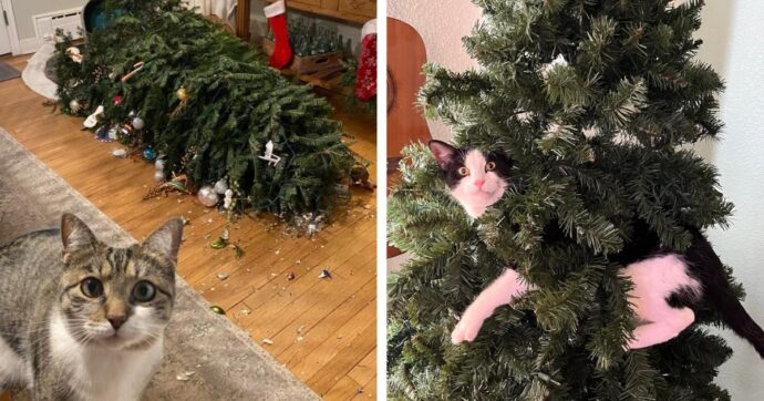 13. “В борьбе с елками коты используют самые разные методы. Но я впервые вижу хвостатого, который решил ее съесть.”