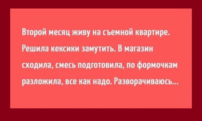 8. Второй месяц живу на съемной квартире. Решила кексики замутить. В магазин сходила, смесь подготовила, по формочкам разложила, все как надо. Разворачиваюсь и понимаю, что духовки нет.