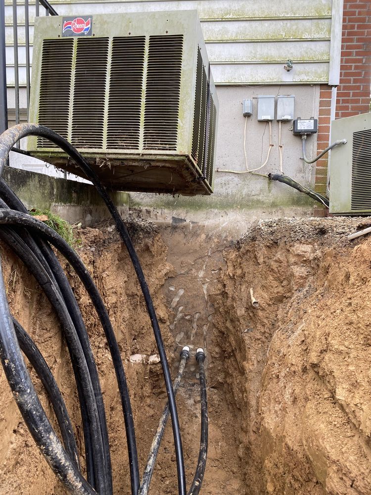 Огромный внешний блок закреплён на хиленьких перилах, а в траншее работают люди.