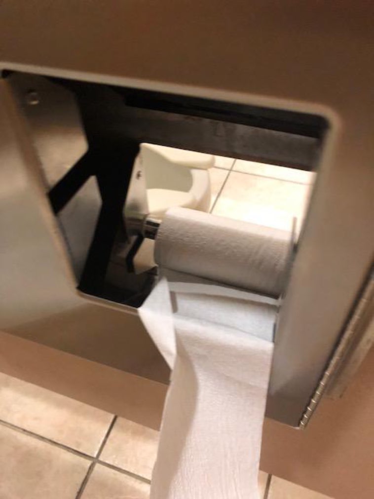 4. Между двумя кабинками в туалете сделали отверстие и поместили туда рулон туалетной бумаги