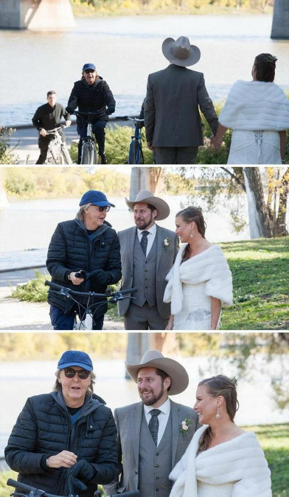 Пол Маккартни прервал свою велосипедную прогулку, чтобы поздравить молодоженов.