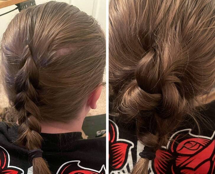 9. «Моя попытка заплести косичку по сравнению с попыткой мужа. Он старался, это точно! «