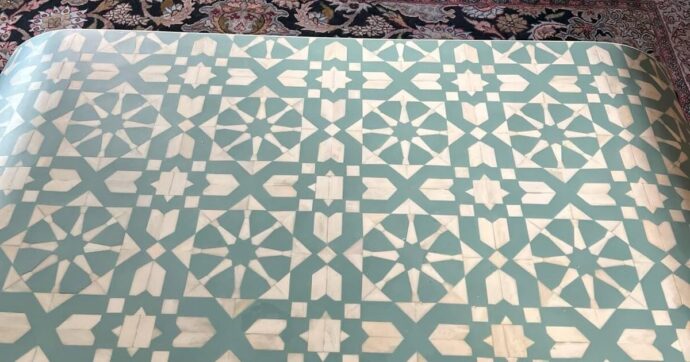 Оказалось, в самом центре узора на столе не хватает одного треугольника — зелёная плитка, из которой должна была быть составлена геометрическая композиция, попросту лишена нужного фрагмента.