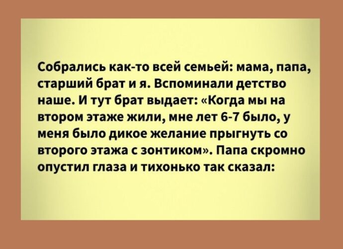 Собрались как-то всей семьей: мама, папа, старший брат и я. Вспоминали детство наше. И тут брат выдает: «Когда мы на втором этаже жили, мне лет 6-7 было, у меня было дикое желание прыгнуть со второго этажа с зонтиком». Папа скромно опустил глаза и тихонько так сказал: «Не получилось бы… Зонтик выворачивается…»