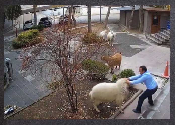 Кадры с камер видеонаблюдения, опубликованные в социальных сетях, запечатлели то, как овца, коза и три овечки совершают набег на мэрию Невшехира, Турция.