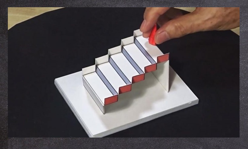 Лестница Шрёдера представляет собой оптическую иллюзию, а именно двухмерный рисунок, который можно восприниматься либо как рисунок лестницы, ведущей слева направо вниз, либо той же самой лестницы, только перевернутой вверх дном. Это классический пример изменения перспективы в психологии восприятия. Сугихара же взял эту идею и превратил её в трёхмерную модель.