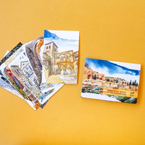 Как-то я пришел в музей Иланы Гур в Яффо. Экскурсоводом там была Ксения Ревзина, она меня узнала, сказала, что она художница, много рисует про Израиль и хотела бы показать свои работы. Кажется, в разговоре с ней впервые и прозвучало слово «открытка». А давайте, мол, сделаем настоящую открытку – с одной стороны будет оригинальный авторский рисунок, а с другой стороны – место для текста, адреса и почтовой марки. О том, что никто сейчас уже открытки не отправляет, мы особо не задумывались. Просто сама идея показалась интересной. К тому же, открытка, в отличие от нашей съедобной продукции, может храниться вечно и она ничего не весит, что крайне важно, когда речь идёт об отправках наборов за границу. А потом к нам пришел большой заказ, кажется, на 3 тысячи наборов для одной еврейской общины. Был карантин, почти вся страна сидела без работы. И мы предложили заказчику вкладывать открытки с рисунками об Израиле. Заказчик идею поддержал. Мы сообщили об этом проекте тем, кто был рядом, про кого слышали. Так мы собрали работы 11 художников. Среди них была Ира Пресс, художница, дизайнер, работавшая арт-директором в международных рекламных агентствах в России. Она помогла технически превратить картины в открытки, она же познакомила нас с искусствоведом и куратором галереи «Скицца» в Иерусалиме Мариной Шелест, а та, в свою очередь, – с искусствоведом Мариной Генкиной.