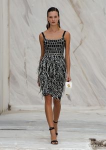 Платья с бахромой – один из главных трендов лета 2022 – это может быть классическая бахрома или просто свисающие нити или шнурки. Дизайнеры допускают любые ее варианты, как впрочем, такая отделка может украшать как все платье, так и его элементы, например, только рукава или только юбку. Только не забывайте, что такой наряд не требует дополнительного декора.