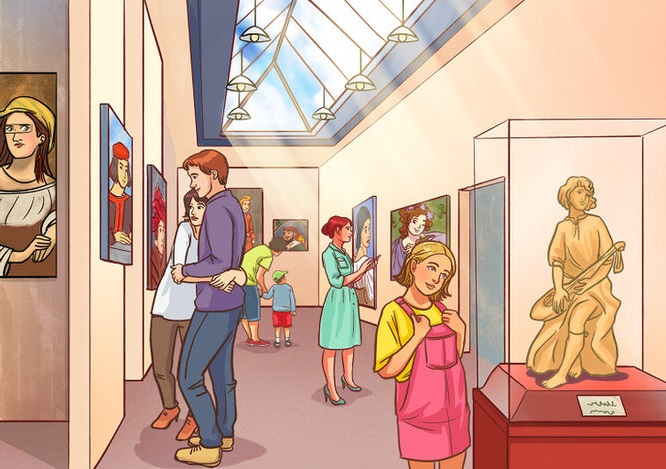 Картины и скульптура, конечно же, не идут в счет — это не люди. А за одним из полотен прячется наблюдатель.