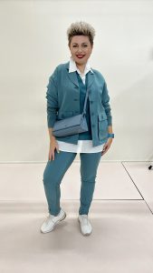 Еще один стилистический прием – это монохром, когда образ создается из вещей одного цвета. Одежда одного оттенка тоже создает вертикаль, на этот раз цветовую, которая визуально вытягивает фигуру. Чтобы монохром не выглядел скучновато, выбирайте акцентные интересные цвета. Если же вы предпочитаете базовые, то поэкспериментируйте с фактурами и тканями и добавьте яркие аксессуары. Это добавит образу динамики. И последний штрих – немного поднимите рукава жакета и рубашки, так ваши руки будут смотреться стройнее.