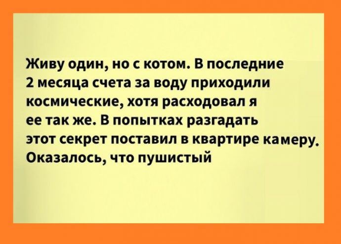 Живу один, но с котом. В последние 2 месяца счета за воду приходили космические, хотя расходовал я ее так же. Заметил, что и счетчик больше наматывал, судя по старым квитанциям. Вызвал сантехника, тот подтвердил: ошибки нет, воды действительно стало уходить в 3 раза больше, соседи не подключались никак. В попытках разгадать этот секрет поставил в квартире камеры, так как все, у кого есть ключи от квартиры, открещиваются и клянутся, что не заходили… Оказалось, что пушистый научился открывать (поднимать) кран и залипает на текущую воду по 6 часов в день! А так как кран нужно либо доводить до щелчка, либо он сам потом закрывается, я не мог его запалить сразу же. Купил домой декоративный фонтанчик, пусть развлекается.