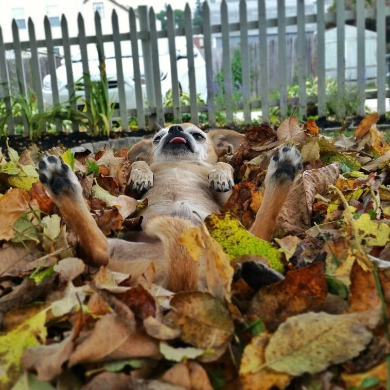 11. “Что может быть лучше, чем с разбега нырнуть в огромную кучу осенних листьев? И нашей чихуахуашке это хорошо известно.”