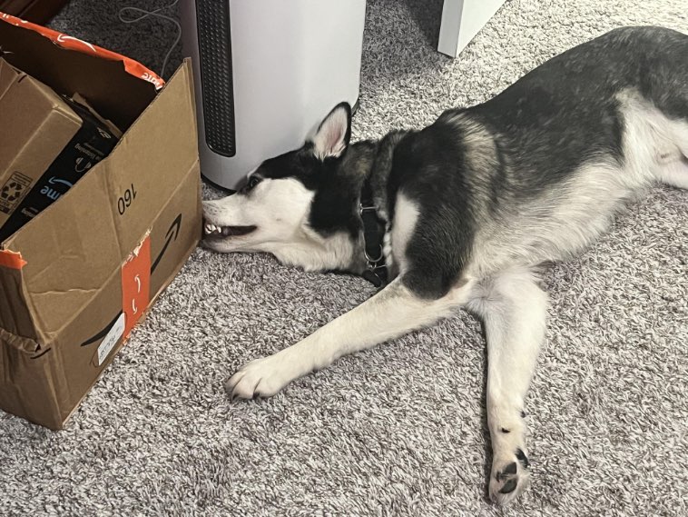 15. “Застукала пса на том, что он грызет коробку. Но этот хитрец решил притвориться, будто он ничего не делает, и просто застыл в такой позе.”