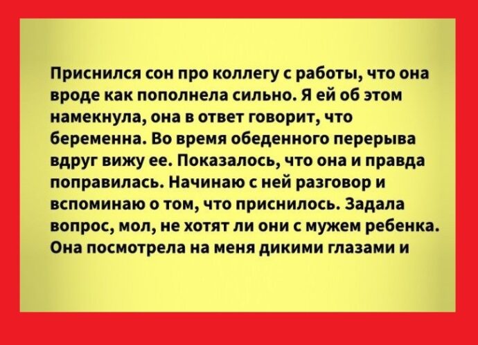 Приснился мне сон про коллегу с работы. Вижу, что она вроде как пополнела сильно. Я ей об этом намекнула, она в ответ говорит, что беременна. Просыпаюсь утром и, как обычно, забываю свой сон. Во время обеденного перерыва вдруг вижу ее. Показалось, что она и правда поправилась. Начинаю с ней разговор и вспоминаю о том, что приснилось. Решила задать вопрос, мол, не хотят ли они с мужем ребенка. Она посмотрела на меня дикими глазами и говорит: «Только не говори, что тебе приснилось, что я беременная. Мне об этом уже 3 человека сказали в офисе!» Ну вот не верь после такого в мистику!