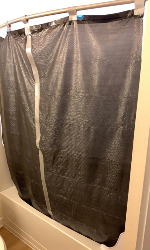 “Срочно нужна была занавеска для душа в новую квартиру. Новая придет только через пару дней, поэтому пришлось импровизировать. В этом мне помогли мешки для мусора и скотч.”
