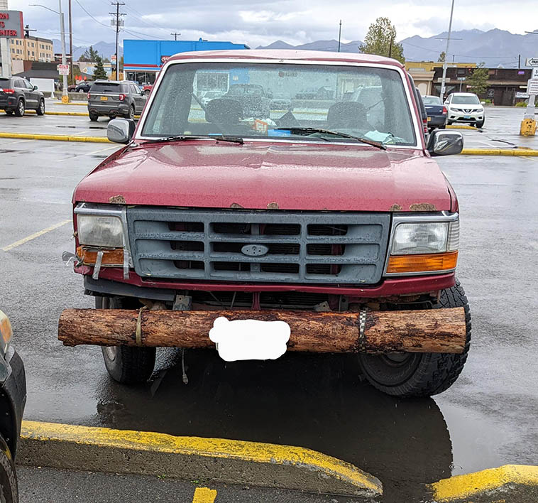 Ну тут целый инженерный набор! И скотч, и ремни, и бревно вместо бампера.