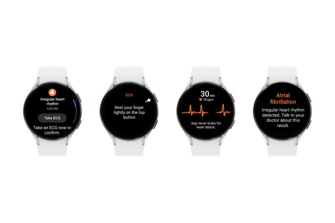После активации в приложении Samsung Health Monitor эта функция будет проверять нерегулярный сердечный ритм в фоновом режиме с помощью биоактивного датчика Galaxy Watch. Если определенное количество последовательных измерений выявит нерегулярность ритма нерегулярным, Galaxy Watch предупреждает пользователя о потенциальной опасности мерцательной аритмии, предлагая ему снять ЭКГ с помощью часов для более точного измерения.