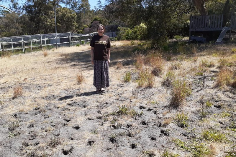 На лужайке Мюррей есть редкие участки желтой травы, сморщенные растения и сухие выбоины, оставленные местными бандикутами.