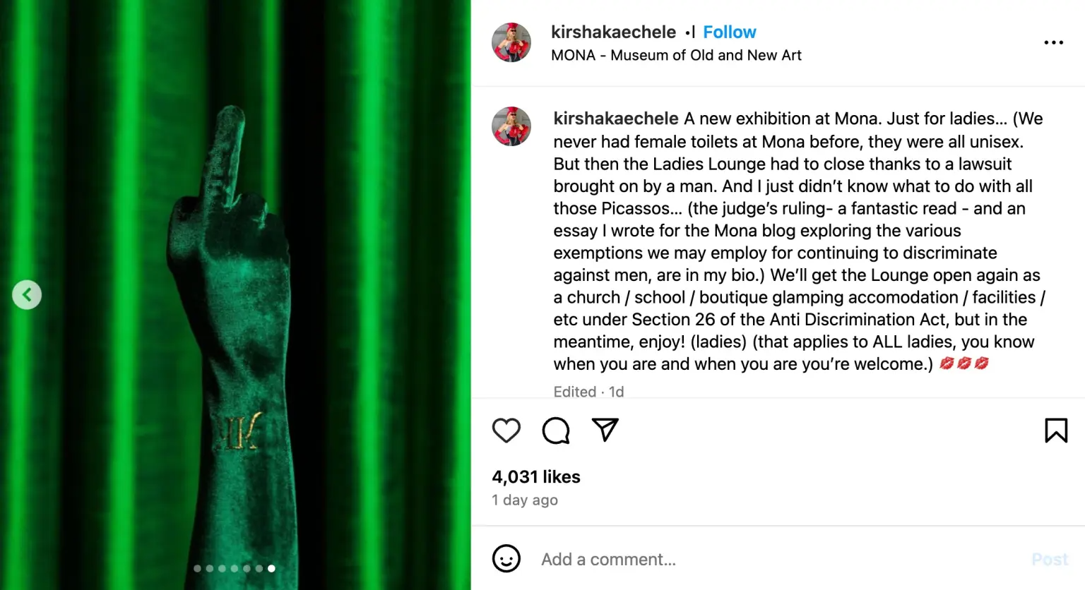 Спорная художественная выставка, предназначенная только для посетителей-женщин, под названием «Женская гостиная» и созданная художницей Киршей Кечеле в Музее старого и нового искусства Тасмании (МОНА), спрятала работы Пабло Пикассо в женском туалете после постановления суда.