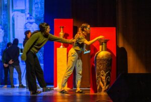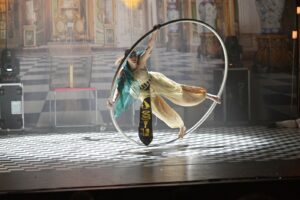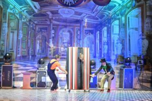 Шоу называется «Безумная ночь в музее – 2», и это больше чем цирк. То есть, безусловно, здесь представлена широкая палитра циркового мастерства: жонглеры и эквилибристы, летающие акробаты и гимнастки, чьи тела поражают невероятной гибкостью и ловкостью. Но это не просто набор номеров, которые объявляет шпрехшталмейстер, как это было в цирке детства тех, кто сегодня приводит на представление младших внуков. «Безумная ночь в музее – 2» – это цельная история с захватывающим сюжетом, в который, подобно тончайшим кружевам, вплетаются трюки в виртуозном исполнении и в безупречном хореографическом решении.