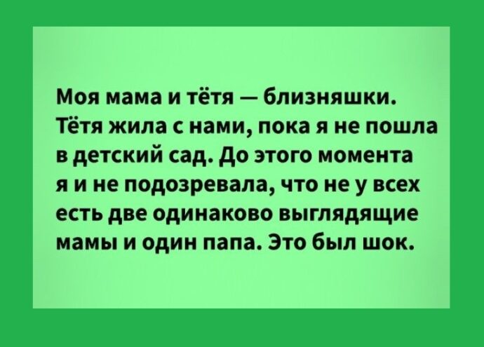 Моя мама и тётя — близняшки. Тётя жила с нами, пока я не пошла в детский сад. До этого момента я и не подозревала, что не у всех есть две одинаково выглядящие мамы и один папа. Это был шок.