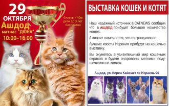 Дорогие любители кошек! Приглашаем вас в Ашдод на Выставку кошек и котят! Выставка пройдет с 10.00 до 16.00 в матнасе «Дюна», на ней будут представлены кошки и котята самых редких и уже популярных…