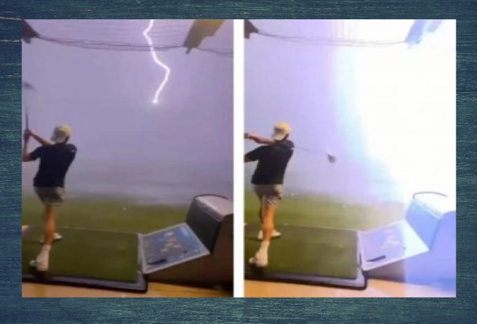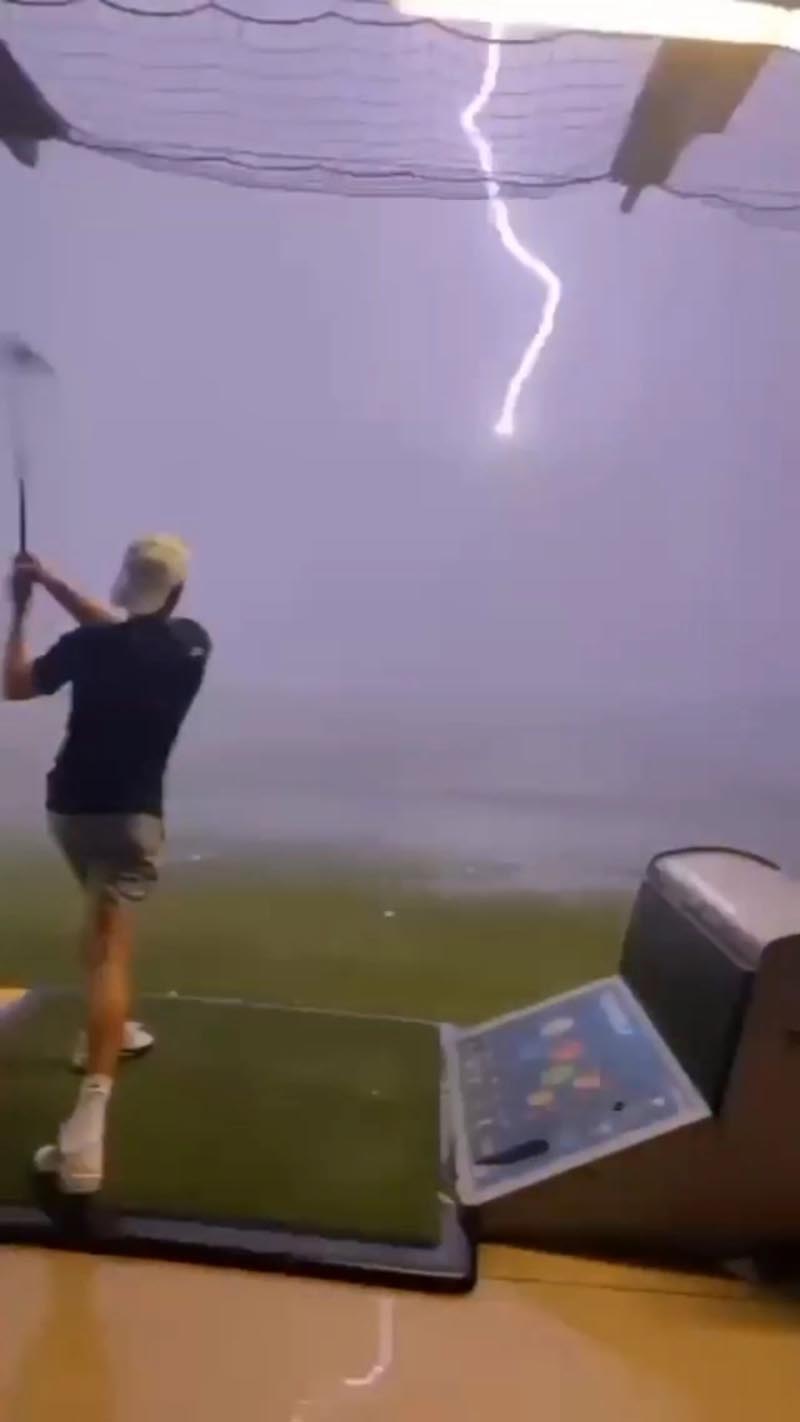Это невероятный момент, когда в мяч юного гольфиста, сразу же после того, как он ударил его во время грозы, угодила молния.