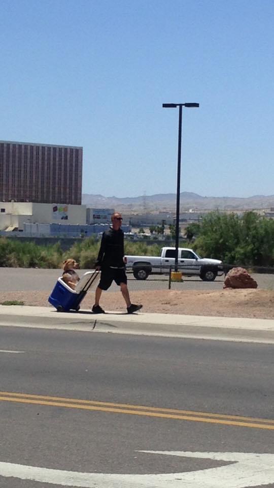 9. Хозяин не хотел, чтобы его пёс обжёг лапы на горячем асфальте, поэтому повёз его гулять в мини-холодильнике
