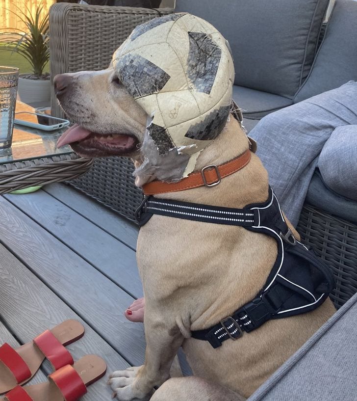 Наш пёс порвал мяч в клочья, а потом надел на голову!