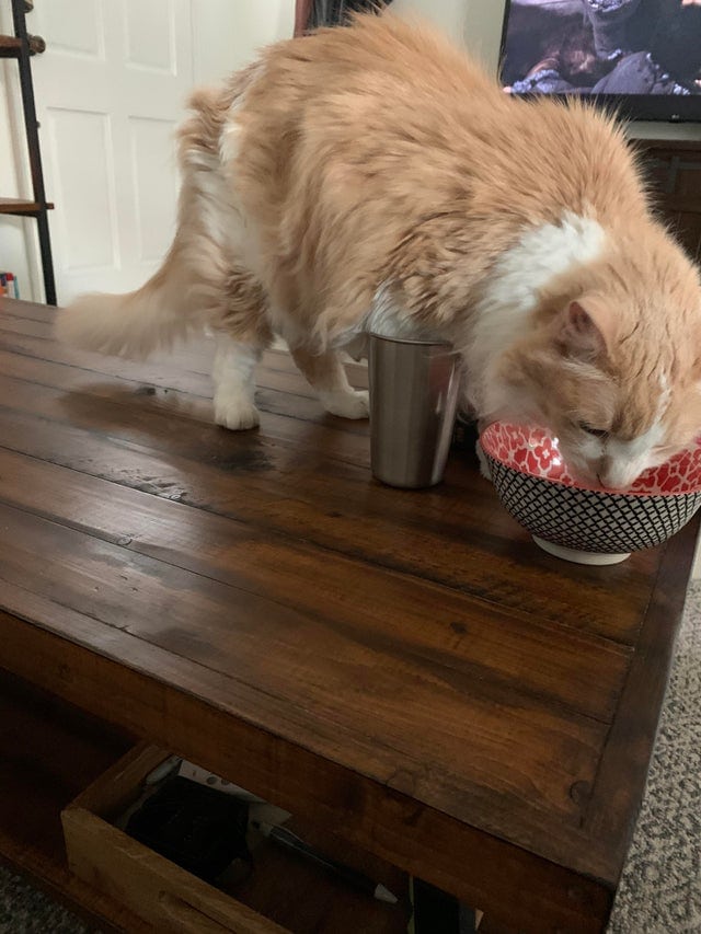Стоя лапой в моей кружке с кофе, он ест из моей же миски!