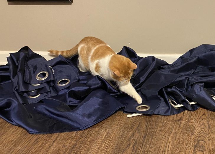 Уронил шторы, посмотрел прямо на меня и начал с ними играть…