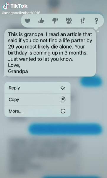 “Это дедушка. Я читал статью, в которой писали, что, если вы не найдете себе партнера до 29 лет, то, скорее всего, умрете в одиночестве. Твой день рождения уже через 3 месяца. Просто хотел, чтобы ты знала”, – написал он.