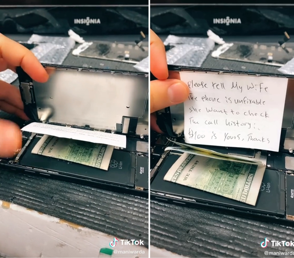 Когда мастер начал ремонт, он вскрыл технику, и внутри обнаружил записку с необычным посланием. Внутри лежал небольшой клочок бумаги и купюру в $100.