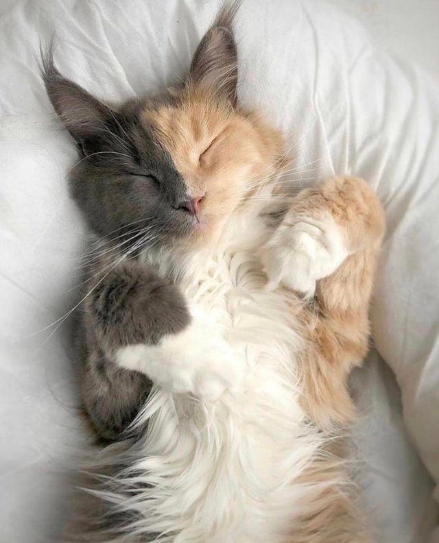 У этой красавицы кошачья химера, что означает, что её клетки содержат два типа ДНК. Поэтому шёрстка на её мордочке ровно разделена на два цвета.