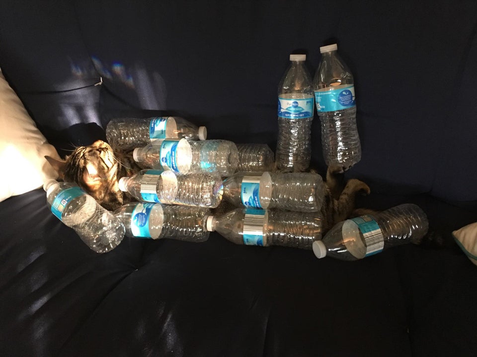Задача была в том, чтобы обложить пустыми бутылками нашего кота, не разбудив его.