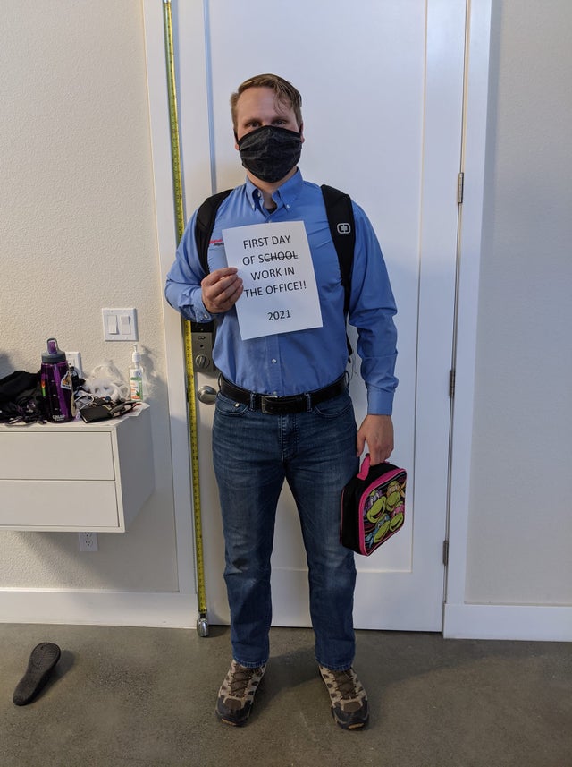 Надпись на листочке: «Первый день работы из офиса в 2021 году».