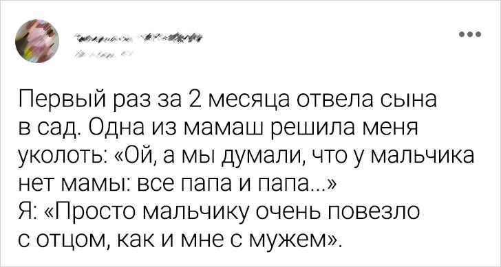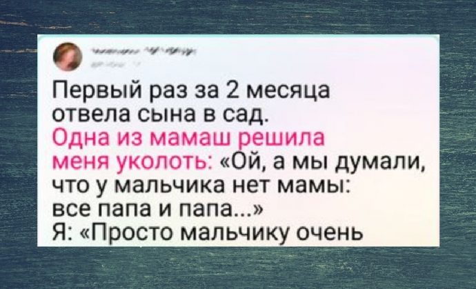 - Было это 21 год назад. Была я беременна, и уже довольно заметно. Стою на остановке, жду троллейбус. А тут идут мимо 2 бывших одногруппника, с которыми давно не виделись. Они на мой живот посмотрели и спрашивают: «Кого ждешь?» Ну я им честно и ответила: «Троллейбус». И долго не могла понять, почему они от меня бочком-бочком отошли. © Лиза Петрова / Facebook