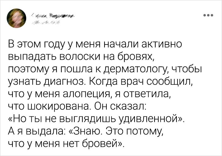 - В 17 лет неформалила, побрилась на спор налысо, но одевалась в платья и юбки. Встречалась при этом с крутым брутальным бородатым качком-байкером с длинными волосами. Вот как-то едем в маршрутке, залезает бабулька, протягивает мне деньги и говорит: «Парень, передай!» Я отвечаю, что я не парень. Бабулька не растерялась, повернулась к моему байкеру и сказала: «Ну тогда, внучка, ты хоть передай!» © Подслушано / Ideer